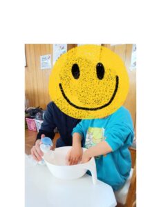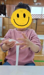 「ねばねばしてきた」「固まっているところもある」「ふわふわしてきた」と途中の変化も楽しんでいました😊