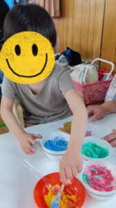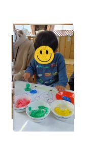 感触に苦手を感じるお子さんも、初めはスプーン等、道具を使って遊んでいましたが、みんながやっている所をみたり、夢中になってくると最後は自分の手で触る姿も見られました。