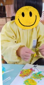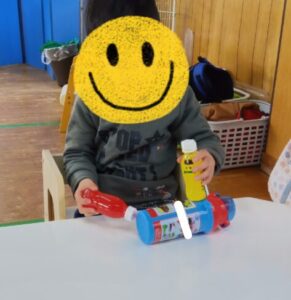 泡ハンドソープを使った事で匂いに敏感なお子さんも、気にすることなく触ってみたり、探求心が芽生え、「これをもう少し入れたらどうなるかな?」と実験に夢中になる姿もありました。